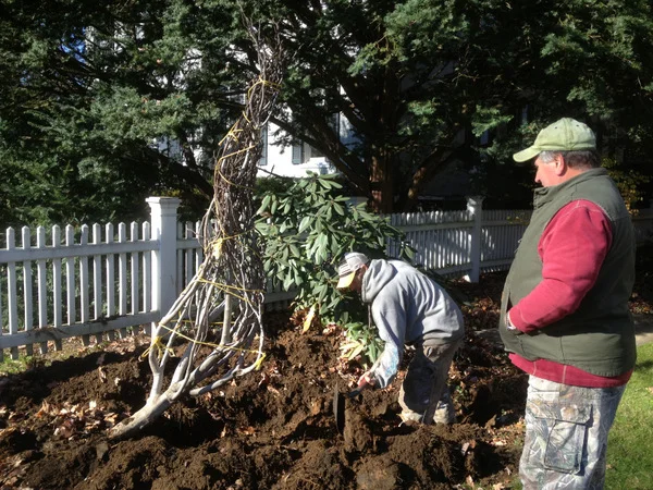 They first bundled and tied the branches with rope and then dug the deep trench. My tree doesn't grow perfectly upright which makes it easier to lower into the hole. In the above photo, the soil around the roots has been loosened, so the tree is now leaning even more than usual.