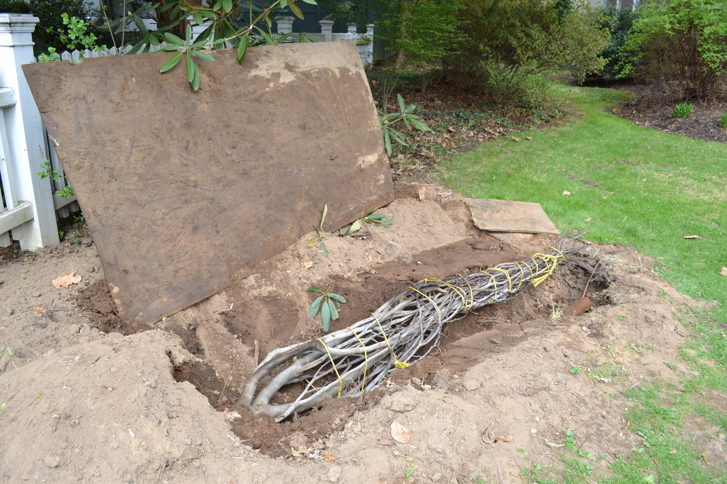 The wood is covered with several inches of soil except for a small opening along one edge which allows air to circulate to keep the tree dry and free of mold and rot. The opening is sealed only during the coldest days of mid-winter.